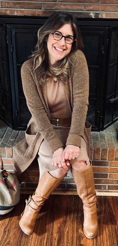 These boots, by Nine West are seriously high, but are a great color that compliments several of my monochromatic looks (I’ll do a series on monochromatic looks at a later date.) What I love about these (besides the color) is how long they make my legs feel.