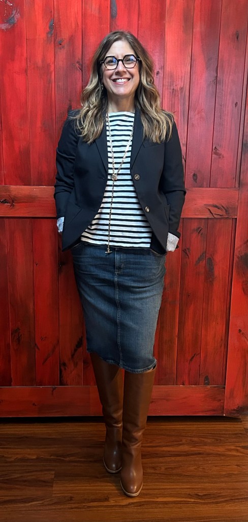 This look feels like a classic. A basic striped longed sleeve T paired with a navy blazer and caramel boot, how could you go wrong?