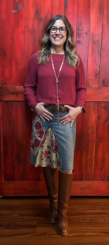 I found this upcycled skirt at a vintage store about a million years ago. It’s so unique, which makes it a lot of fun to wear. Here, you’ll see I am wearing it with a red silk shirt, a long gold chain and my caramel boots.