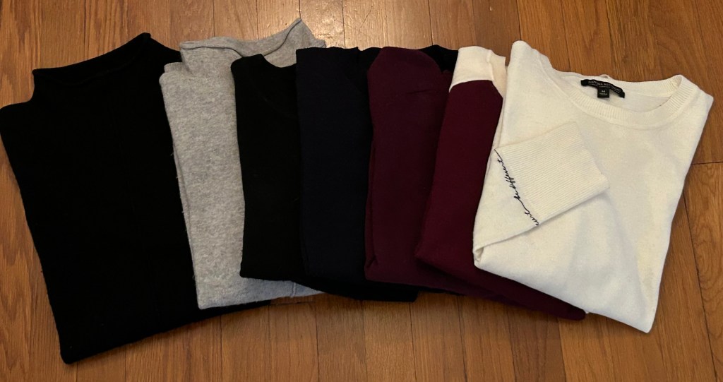 I love a good sweater, especially on a cold day, but I don’t always want the bulk that some heavy sweaters add. So over the years I have stocked up on a variety of colors of Italian Merino Blend sweaters. They are relatively thin, but warm, great for layering and easy to pack.