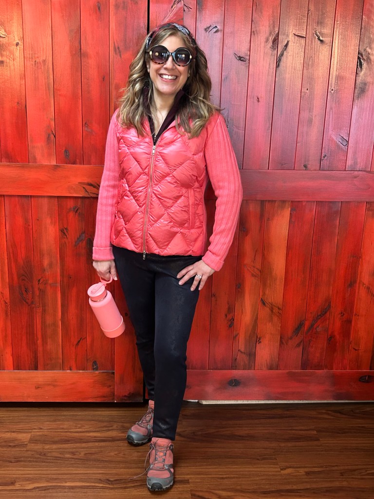 A surprising ‘Pop of Pink” pulls this otherwise muted plum hiking outfit just the right bit of a pizzazz!