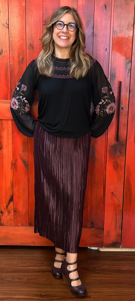 This romantic boho top from Mystree, pairs beautifully with this pleated (and stretchy) skirt in a metallic mauve from Anthropologie.