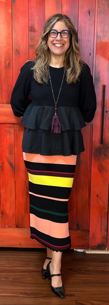 And you may remember this Anthropologie skirt from a previous post, here I’ve paired it with an orange top by Suzy D and a vegan leather jacket.