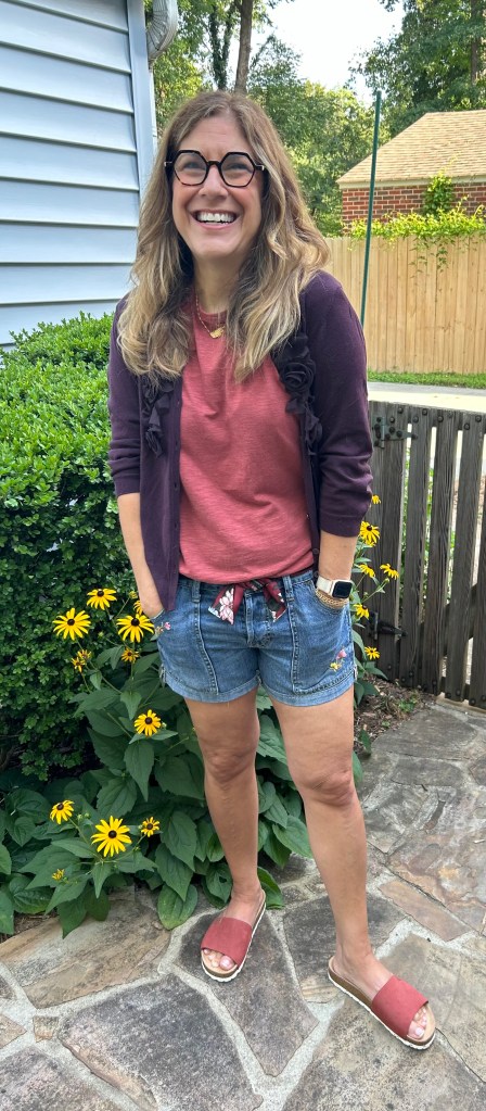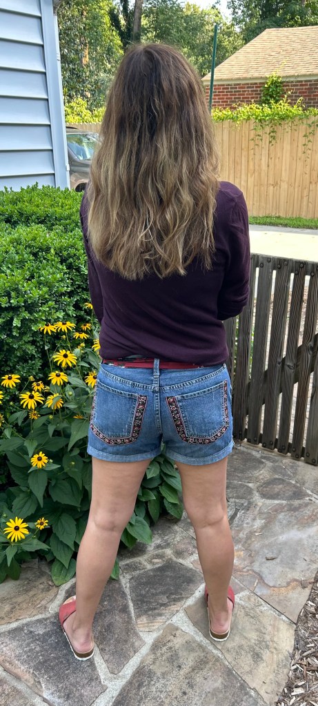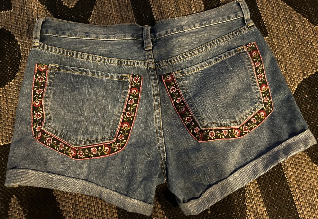 I took an old pair of Gap shorts that were a little too long and I shortened them, added some fabric patches to the front and this cool ribbon I found while looking for the patches around the back pockets.