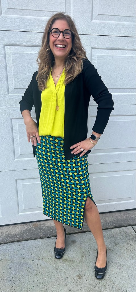 Sweater: Scott Taylor, Top: Rachel Zoe, Skirt: Diane Von Furstenberg, Shoes: Channel