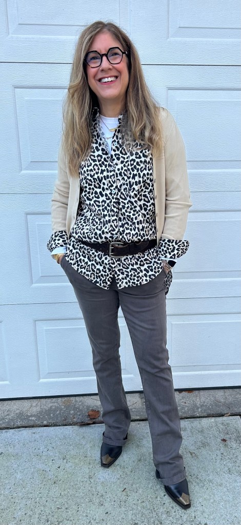 Shirt: Maeve, T-shirt: Pilcro, Sweater: Ann Taylor, Pants: Cosmic Blue Love, Shoes: Sundance
