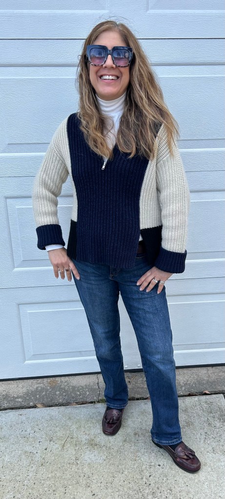 Sweater: Victor Alfaro, Turtleneck: Loft, Jeans: Banana Republic, Shoes: Bass