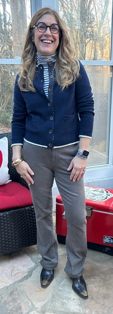 Sweater: Brooks Brothers, Turtleneck: Loft, J Crew, Pants: Cosmic Blue Love, Shoes: Sundance