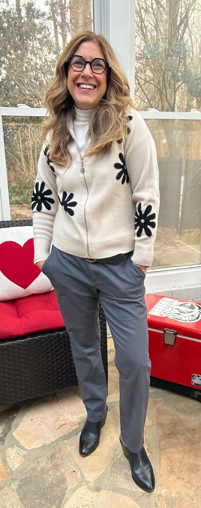 Sweater: Sioni, Turtleneck: Loft, Pants: Loft, Shoes: Frye