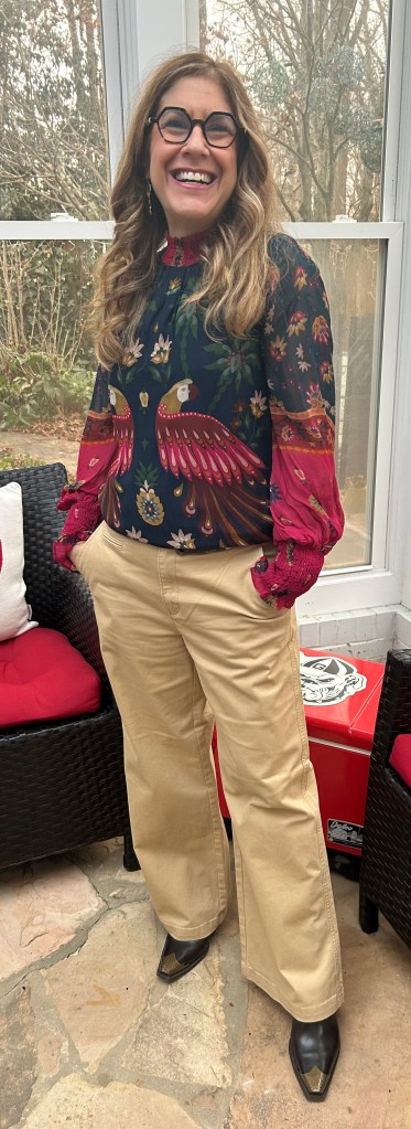 Shirt: Farm Rio, Loft: Pants, Shoes: Sundance Catalogue