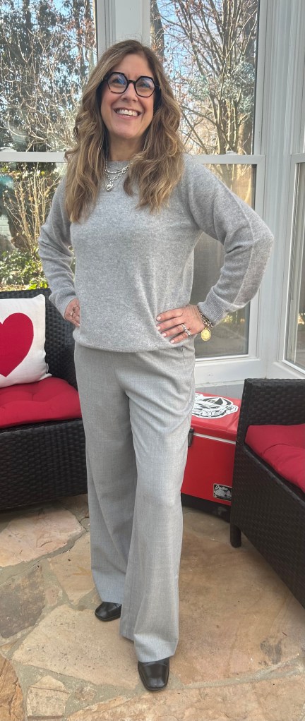 Sweater: Light weight cashmere and Pants: Light weight wool – both Banana Republic, shoes: Franco Sarto