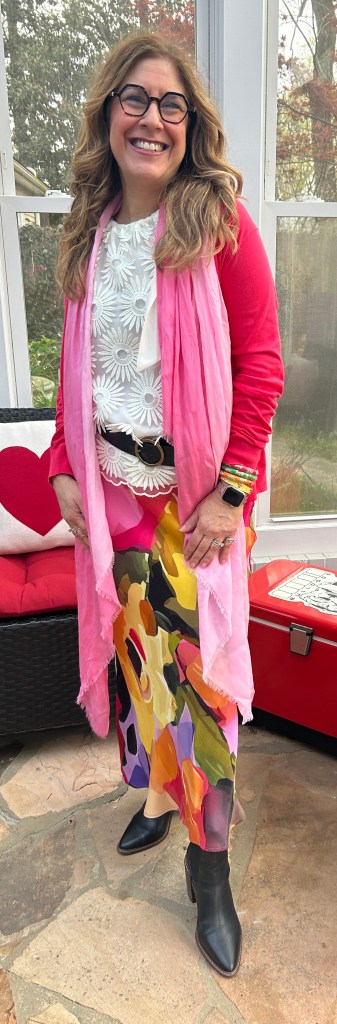 Dress: Conditions Apply, Sweater: J. Crew, Top: Trina Turk, Boots: Crown Vintage, Belt: Anthropologie, Scarf: Talbots